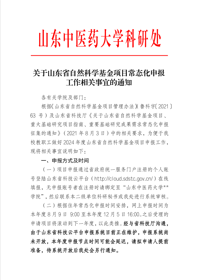 关于山东省自然科学基金项目常态化申报工作相关事宜的通知