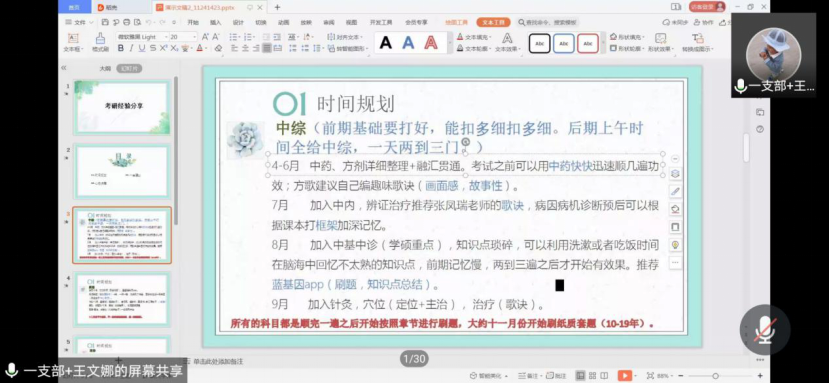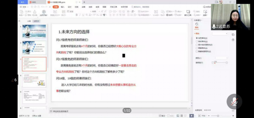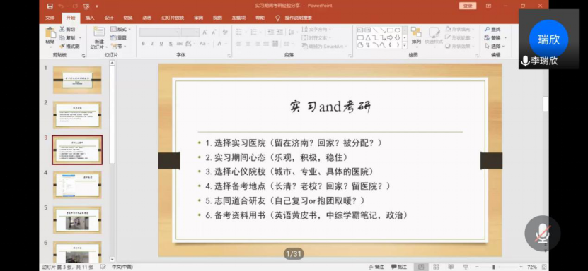 学生第一党支部的王文娜同学向同学们分享了考研的时间规划和学习建议。条理清晰、实用性强的分享对即将考研的同学帮助良多。学生第二党支部的迟显苏同学深入浅出地讲述了医学上对于未来规划的建议,对实习与保研、考研的关系处理作出了客观的解读——保研考研过程中都不能落下实习,她特别强调了热爱与合适的重要性,“海有舟可渡,山有路可行,此爱翻山海,山海皆可平。”李瑞欣同学分享了从实习到备考多个方面的实用经验,着重分析了如何平衡实习与考研之间的关系,使得同学们对考研备考有了更全面的认识。在互动环节中,三位优秀毕业生党员对同学们提出的在学习、生活中的疑惑进行细心答疑,使同学们坚定理想、共同进步。