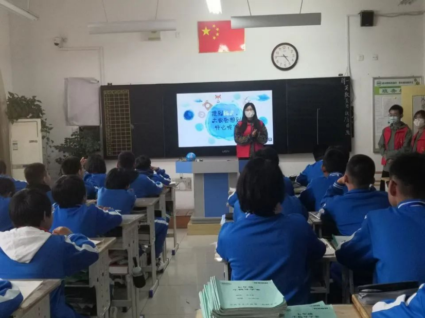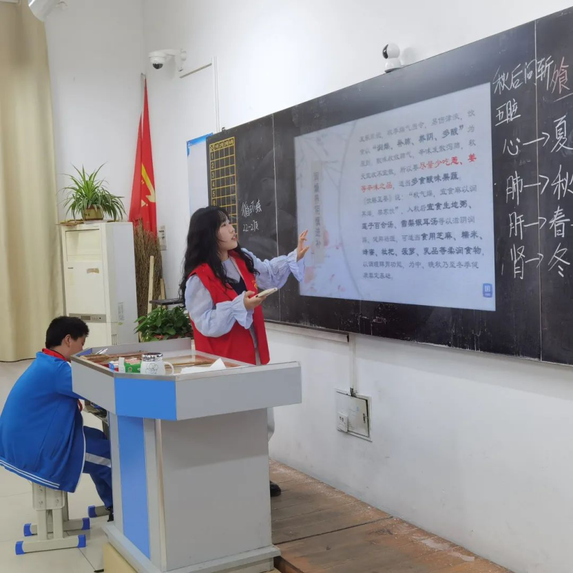 的志愿者们以授课的形式为初一年级的学生们普及霜降与中医药