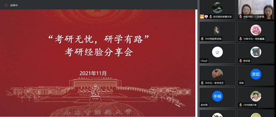 为响应十九届六中全会精神,用心用情为学生办实事解难题,发挥党员先锋模范作用,2021年11月14日晚,快猫短视频 党总支联合快猫短视频 团总支共同举办了线上“考研无忧,研学有路”系列讲座之优秀学生党员考研经验分享会,2016级中医学五年制的姜春宁、于苗、李坤宁、尹淑媛、李昀星、刘熠斐等6位同学受邀做分享报告。2018级中医学(五)、中医学(五)(惠民)、中西医临床医学本科专业以及2021级专升本全体同学参加此次分享会。