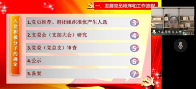 党总支组织员李玉婷同志带领学员们深入学习“党员发展细则”、“党的二十大介绍”和“党的二十大报告全文解读”。教育引导广大入党积极分子牢记党的宗旨,深刻领悟“两个确立”的决定性意义,努力把党的创新理论武装转化为坚定理想、锤炼党性和指导实践、推动学习的强大力量,自觉做共产主义远大理想和中国特色社会主义共同理想的坚定信仰者和忠实实践者,在全面建设社会主义现代化国家过程中贡献青春力量。