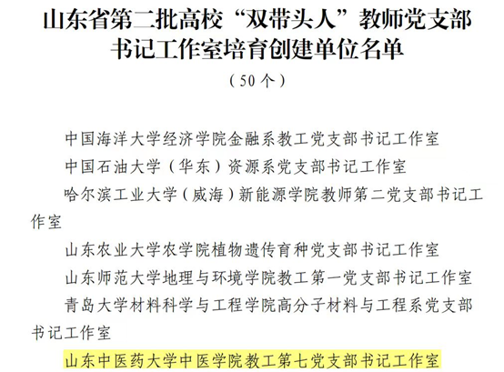 此次荣获山东省第二批高校“双带头人”教师党支部书记工作室的教工第七党支部书记工作室,现有正式党员13名,全部为博士研究生学历,平均年龄41岁,有教授2人,副教授6人。党支部书记任健为省级一流课程、省中医药重点学科负责人。支部承担两门省高教思政示范课程,有全国卫生健康技术推广传承应用项目传承人1名,山东名中医药专家1名,青年党员先后获省高校青年教师教学比赛一等奖、“京鲁杯”课程思政比赛案例奖、全国中医药院校青年教师竞赛一等奖等。以推动学校高质量发展为目标,充分发挥党支部战斗堡垒作用。紧紧围绕一流学科和高水平中医药大学建设奋斗目标,积极发挥专业优势,支部开展了“六个一”党员教师领航活动。即讲好1次党课、参加1次革命传统教育,打造1门教学金课、创新1种教改教法、参与1次社会服务、探索1种科研思政模式等,以经验、典型促进示范引领。近五年推动立项8项国家、省部级教改及科研项目。