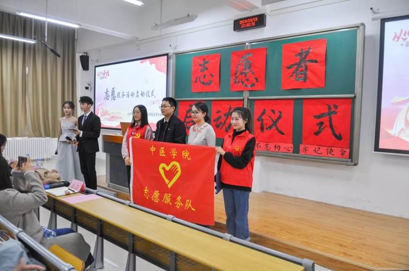 办公室各位辅导员老师,并进行了精彩的致词。在讲话中朱默里老师对志愿者们的表现寄予厚望。她强调,生活在社会中的我们应当回报社会,青年学生应当在给予和奉献中实现自我的价值,收获人生的力量。作为新时代的年轻人,我们中医学子将永怀一颗济世之心,将远大的理想抱负和实际相结合,仰望星空,脚踏实地,坚持为人民谋幸福、为中华民族伟大复兴奋勇前进。随后志愿者代表张筱钰发言,从身边的故事和自身志愿者经验向大家发出呼吁:要用爱心耐心责任心,担负起时代的重任,在人生道路上走的更正更远,并带领志愿者们宣誓。气势磅礴、声音洪亮的誓词,展现着志愿者们服务社会的决心。