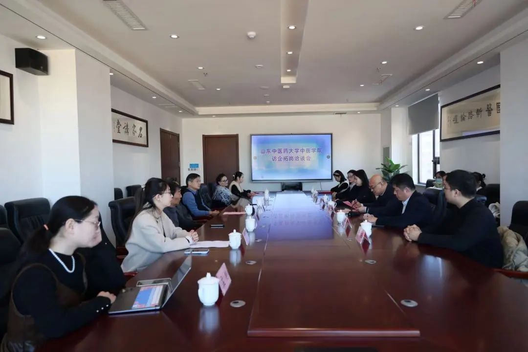鲁药集团董事长申良元介绍了集团的发展现状、医药岗位需求等情况;新中鲁中医医院李树沛院长介绍了医院的基本情况。校院双方就中医药人才的培养进行了深入探讨,表示共同为传统中医人才的培养贡献力量。