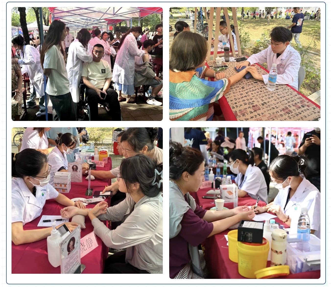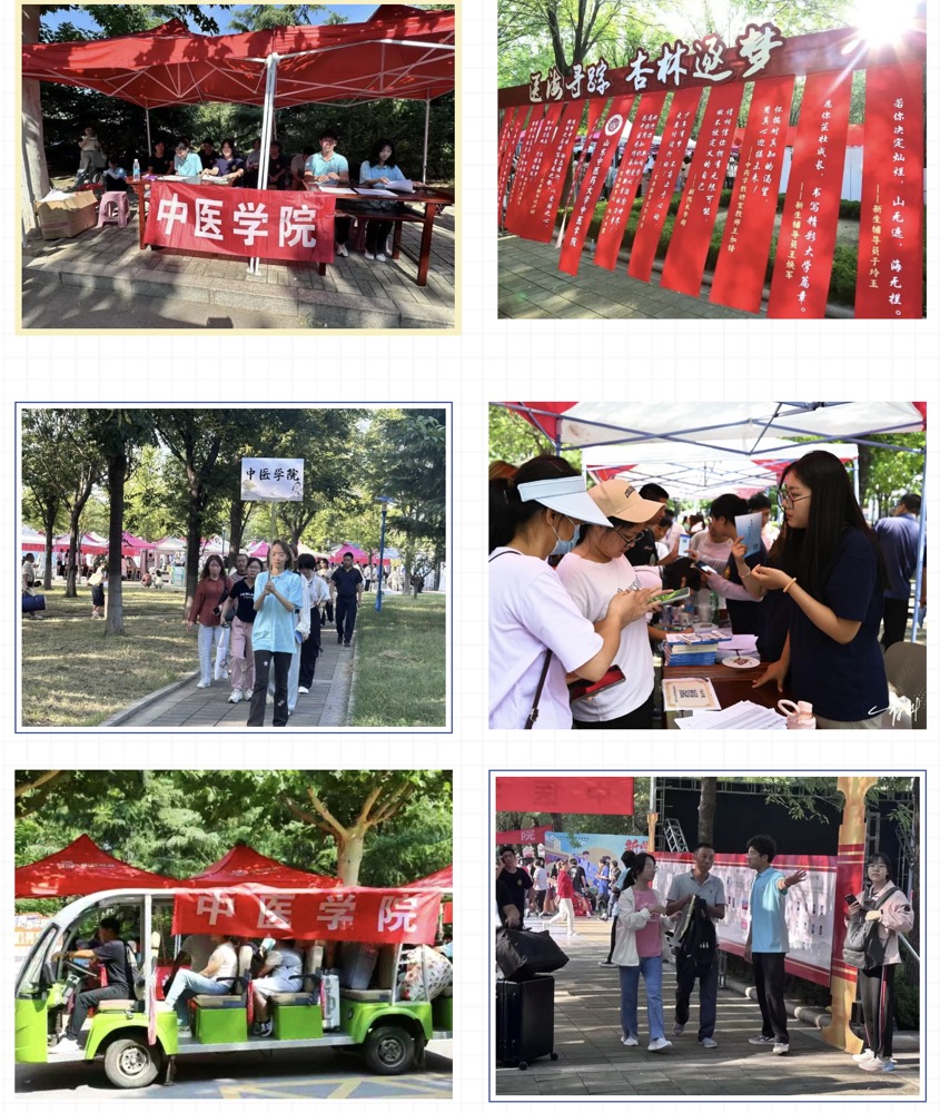 于迎新现场设置“中医文化集市”,下设专家义诊区、学生义诊区、学生推拿区、古籍展示区、饮片香囊展示区、针灸器具展示区、中药特色奶茶区、报道打卡盖章区几个板块,进行中医药文化宣传。