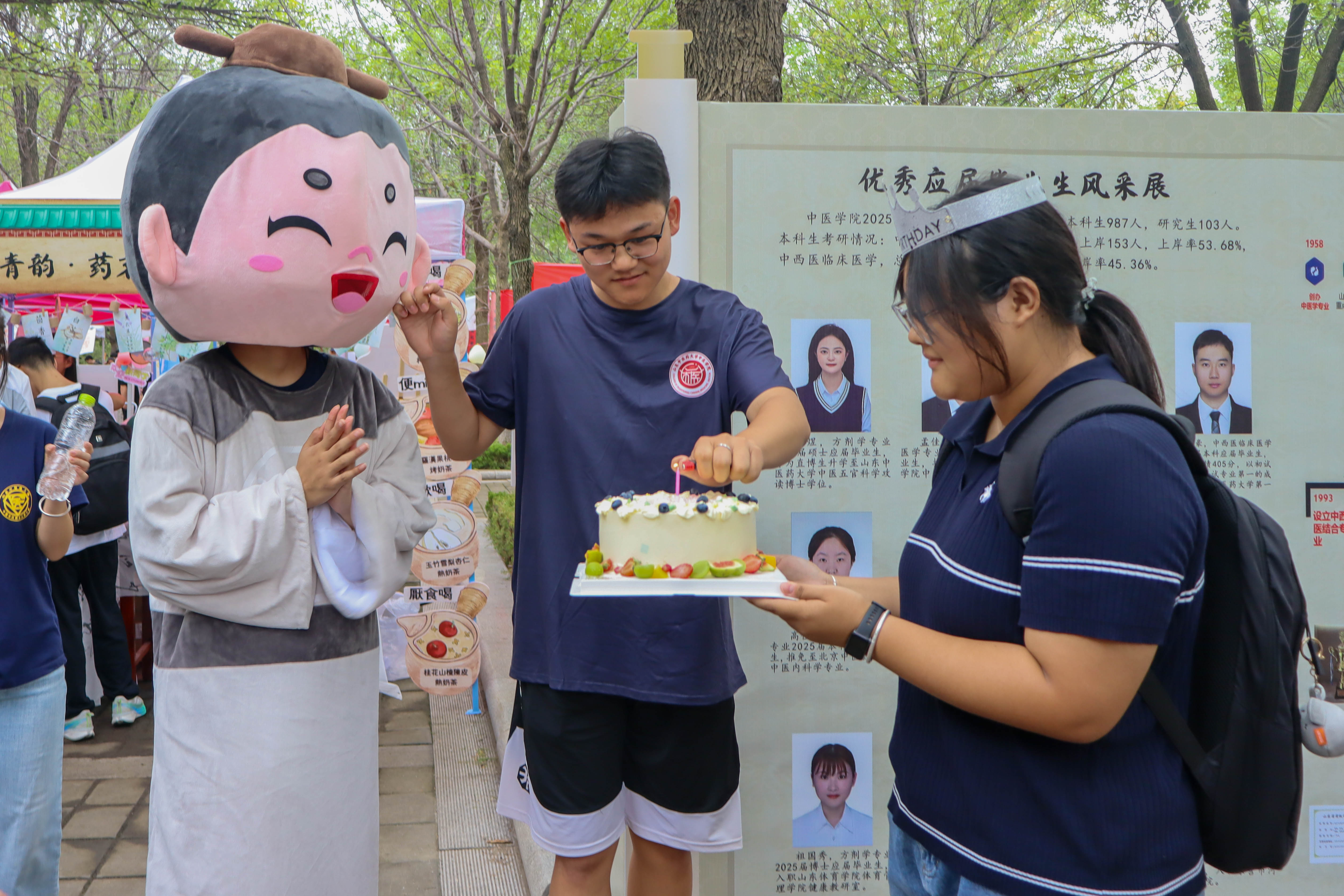 以“五色润心,‘游’中助学”为主题,创新打造“五行五色”中医药文化游园会,将迎新报到与文化传播有机融合。“红医”板块设立新中鲁义诊及学生推拿体验区,帮助新生直观感受中医诊疗的魅力;“青韵”板块聚焦中医生活化理念,通过中药奶茶、药食同源产品体验和《中医药文化与生活丛书》展示,生动传播中药知识;“岐黄”板块借助针灸器具展览和互动游戏,引导新生了解经络穴位与针灸文化;“墨香”板块集中陈列中医经典典籍,彰显中医药深厚的历史底蕴;“白盾”板块则围绕防诈骗、消防安全等主题,以科普宣传和趣味游戏增强新生的安全防护意识。各展区巧妙融合药香与墨香,通过沉浸式、互动化的方式,立体呈现中医药文化的丰富内涵。