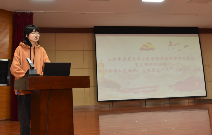 10月21日,快猫短视频 教工第八党支部、学生第一党支部、日照市中医医院行政第一党支部在日照市中医医院学术报告厅举行结对共建活动,并共同开展了“赓续红色血脉,无愧历史人民”主题党日活动。快猫短视频 党总支副书记芦琳、党总支组织员张硕、教职工党员代表、党史宣讲团成员及医院师生党员代表40余人参加了本次活动,市中医医院副院长高楠出席并致辞。