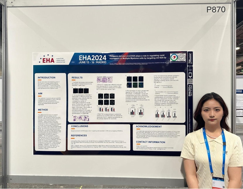 第二附属医院肿瘤中心主任、泰山学者青年专家崔兴教授的指导下共有两篇论文摘要入选并线下参会,其成果《Exosome-derived circCOG5 plays a role in regulating RANKL expression in multiple myeloma cells by targeting mir-625-3p》以Poster形式进行展示,另一篇被收录。