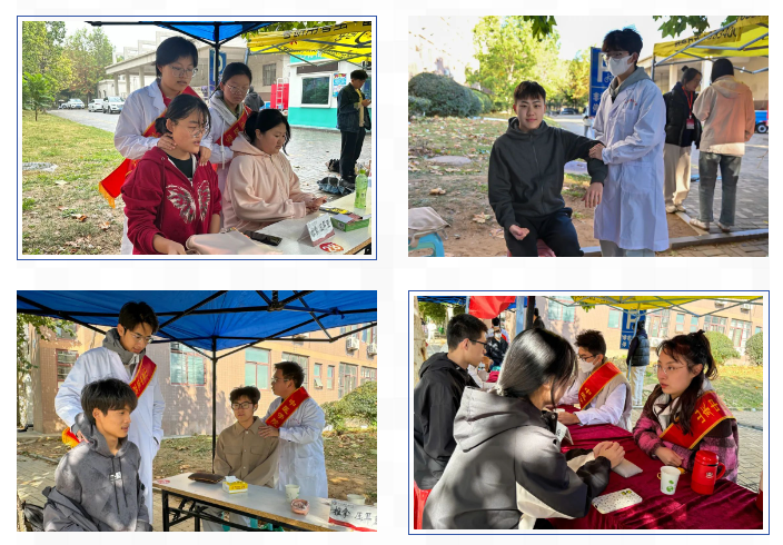 在活动现场,志愿者们围坐一处,为学校师生提供脉诊、推拿、压耳豆、针灸、花茶、香囊等特色中医药项目,让学生们亲身体验中医特色疗法。他们以专业的知识和过硬的技术,不仅为学生们诊病问药,还提供各式各样的药材与精美的外囊供学生们制作香囊。同时,志愿者们还将热门的奶茶制作工艺与传统花茶文化相结合,创新中药奶茶的制作方式,提供给学生们品尝。