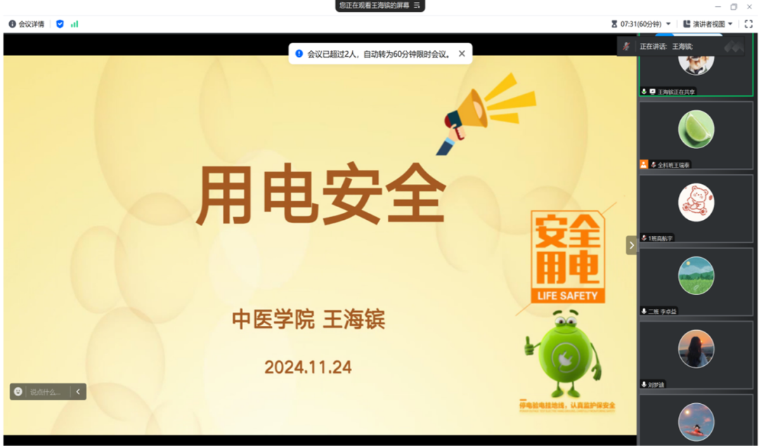 王海镔通过线上线下结合的方式召开了“安全用电,你我有责——大学生用电安全”主题班会。他通过案例展示与分析、常见用电常识介绍等环节,让学生们了解了用电安全和火灾预防手段及防范要点。互动环节更是检验并巩固了学生们的用电安全知识。此次班会增强了学生们的防范意识,为保护生命财产安全奠定了基础。