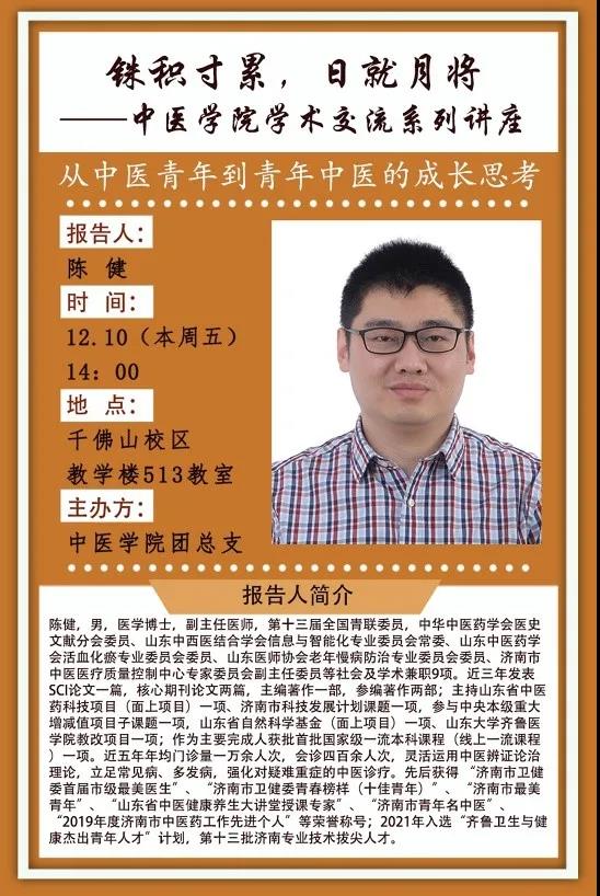 学术交流系列讲座在千佛山校区教学楼513顺利举办。山东大学附属济南市中心医院中医科副主任医师陈健老师开展题为“从中医青年到青年中医的成长思考——从经典到临床的思维切换与实践”的讲座,快猫短视频