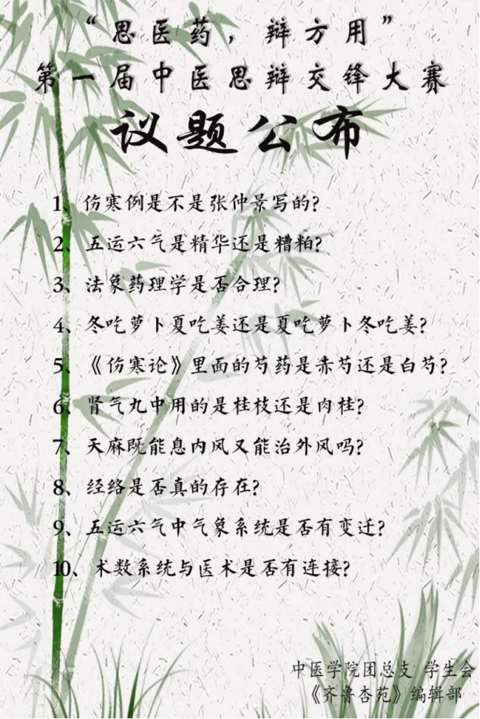 传屐朝寻药,分灯夜读书。正所谓学得愈深,苛求得愈切。感谢各位师哥师姐的参与,第一届“思方药,辩方用”初赛议题已经征集并选定完毕了,议题公布如下。