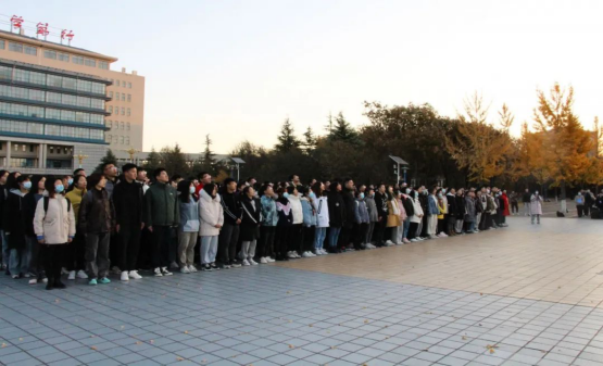 鲜红的国旗伴着朝阳缓缓升起。仪式上,全体师生庄严肃立,向国旗行注目礼,高唱国歌。