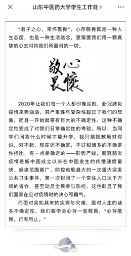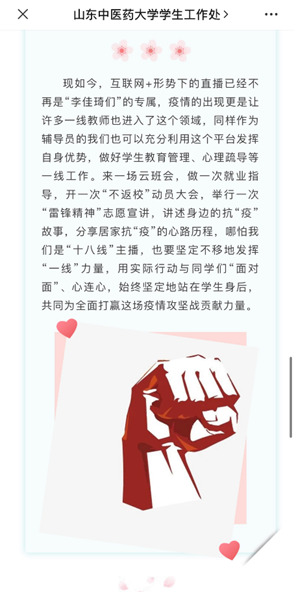 辅导员老师们通过一篇篇寄语,帮助同学们调整心态、正确面对疫情,并为同学们提供了学习和生活等方面的指导和建议。下面让我们来看一下辅导员老师们怎么说~
