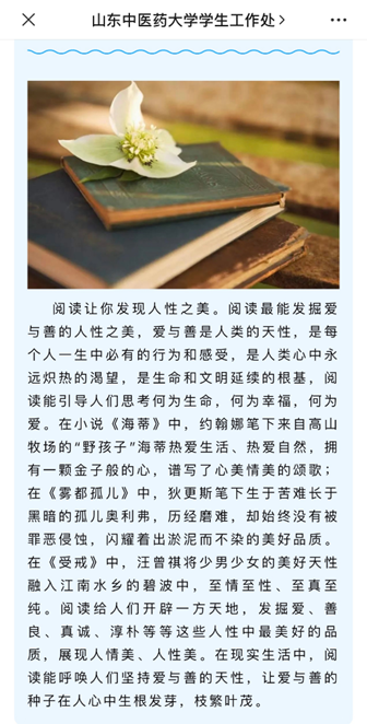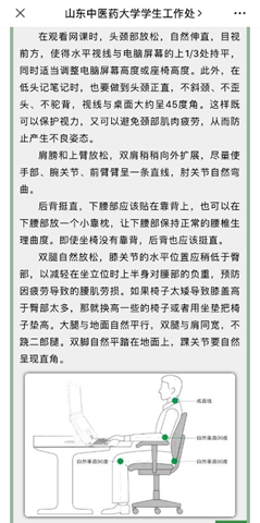 疫情期间居家隔离,但学习从未停止,网课仍在继续。弥漫着焦虑、浮躁的日子里,我们可以手捧一本图书,走进阅读、享受阅读,领略阅读之美,在阅读中收获勇气与力量。开学延迟后,老师们在精心备课、不断摸索后,纷纷做起“十八线主播”,为我们带来线上教学,坚定不移的发挥“一线”力量。别开生面的教学方式让老师和同学们充满了新鲜感,增添了学习的乐趣。同时,为了缓解同学们因观看网课长时间坐立引起的不适,辅导员老师们为我们带来了观看网课的正确打开方式——保持正确坐姿并进行适当的锻炼,并提醒同学们在学习的同时更应注意身体健康,劳逸结合学习会更高效!
