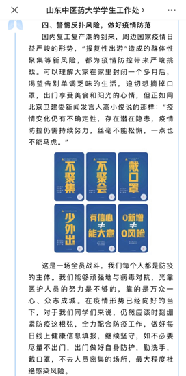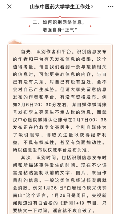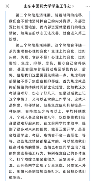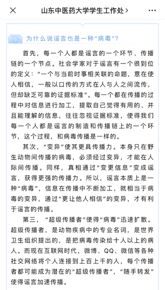 随着疫情的扩散,利用人们的恐惧、担忧之心扩散的谣言也随之出现。这些谣言混淆视听、掩盖真相、将大众误导,极易引起社会的恐慌。疫情期间,同学们的情绪也会受到网络各种信息的影响,心情容易焦虑、紧张甚至惶恐。在此期间,辅导员老师们为我们讲解了如何辨别网络传言是非、打破谣言,并为我们分析了疫情期间同学们心情的发展变化过程。同时,辅导员老师们在文章中告诉同学们应当调节好自己的情绪,保持理性头脑。