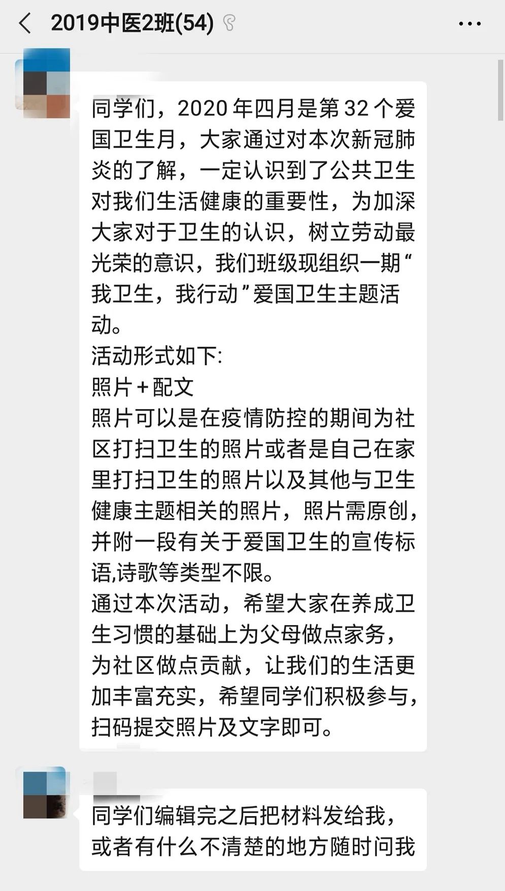 活动期间,大家分享了各自参与的卫生实践故事,阐述了对于爱国卫生的理解和认识,创作了众多爱国卫生行动的宣传标语,掀起了一股“我讲卫生,我爱祖国”的时代暖流。有的同学积极投身社区卫生服务,为社区进行公益消毒;有的同学在家中进行全面卫生打扫,给家人普及基本卫生知识;有的同学在线学习卫生防疫手册,宣传爱国卫生正能量;有的同学从自身做起,每天坚持七步洗手法……大家通过各种方式进行的爱国卫生运动,虽然只是微小之举,但我们坚信:只要每个人都贡献出自己那份小小的力量,这场爱国卫生运动将会带给我们巨大的恩惠。家长们也纷纷支持此次活动,认为卫生运动不仅增加了大家的相关知识,还加强了人们的劳动意识和能力,丰富了同学们的日常生活。活动最后,大家将自己心中的感想与号召通过诗歌、口号的形式互相交流,广泛宣传,共同为爱国卫生运动助力。