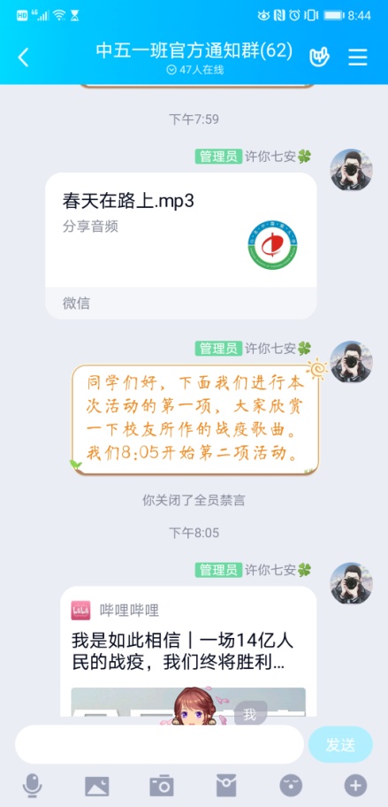 动听而又具有感染力的歌曲不禁深深鼓舞了每位同学,疫情期间在家中,我们并未懈怠,不忘初心,牢记使命,期待春风来,愿君安然返。
