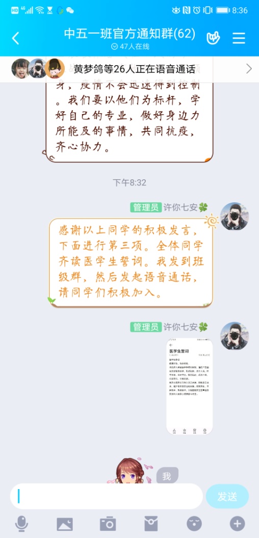 前期,为了积极宣传防疫抗疫活动,2016级中医学(五)01班团支部的团员们纷纷采取线上行动,及时关注疫情的相关报道,并带头鼓励家人做好自我隔离防疫,同时在家中“停课不停学”,每日通过辅导猫按时向学校报告健康监测,并积极主动学习相关专业知识以及习近平总书记的“回信”内容。